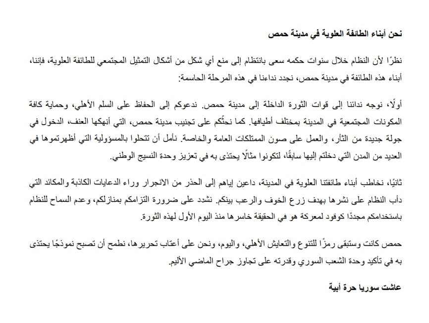 “Given that the regime, during its years of rule, has regularly sought to prevent any form of societal representation of the Alawite sect, we, the sons of this sect in the city of Homs, renew our call at this critical stage: