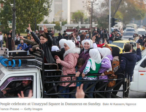 By early December 8, the combined southern forces from Daraa and Suweida had entered Damascus. All the previously revolution-held towns of the southern and eastern Damascus – Darayya, Moademiya, Madaya, Rabadani, Ghouta and so on – once again fell to revolution, despite the expulsion of their populations to the northwest when they were defeated in 2016-18, and their repopulation by the regime with supporters, including many Iraqi and Pakistani Shia, in a sectarian engineering program, which clearly did not save the regime. Then Damascus itself fell to the southern revolutionaries.
