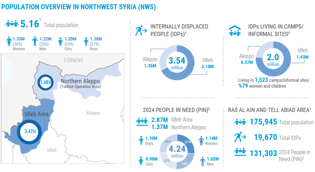 The population in the opposition-controlled northwest consists of 5.1 million people, of whom 3.6 million have been displaced from other parts of Syria, including 2 million living in camps This is in addition to at least 6.5 million Syrian refugees in exile – almost one third of Syria’s pre-war population – of whom 3.7 million are just across the border in Turkey. Without being solved, this massive Syrian refugee population promises to become an ongoing geopolitical issue as surely as its Palestinian refugee counterpart is.