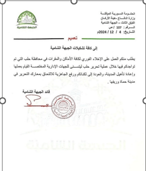 On December 1, an example of such a popular initiative was the Initiative “People of Aleppo for the sake of the Homeland,” which congratulated the Syrian people for being freed from the regime, but made a list of people’s requests including advising “the brothers in military factions to fully discipline the instructions” of their leaders “not to engage in any violation,” recommending “the brothers in military factions to adhere to military fronts, cord holes, military barracks, and complete ban of any armed appearance among civilians,” while calling for “forming a civil administration from Aleppo’s competencies as a transition stage in preparation for the elections.”