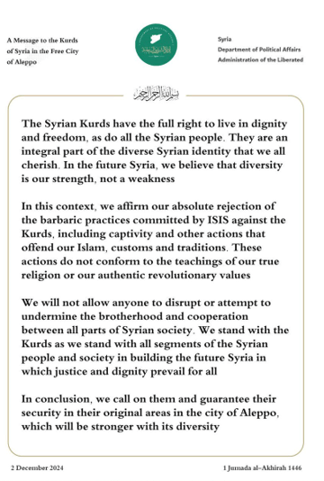 On December 1, HTS issued a statement telling the SDF that HTS’ fight was against the Syrian regime, not the SDF, promising to ensure the safety of Aleppo’s Kurds, and describing the Kurds as “an integral part of the diverse Syrian identity” who “have full rights to live in dignity and freedom,” calling on them to remain in Aleppo; notably also is HTS’s condemnation of “the barbaric practices committed by ISIS against the Kurds:”