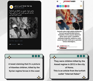 Another class of examples are those that claim crimes committed by Israel were actually occurring on the Syrian coast at the time. Verify Syria exposed this “widely shared video [which] claimed that Syrian aircraft bombed civilian homes with barrel bombs. In reality, the footage shows Israeli airstrikes on Qusaya, Lebanon, in December 2024.” Even crimes committed in India were passed off as crimes on the Syrian coast. The second photo above, showing a Syrian child named Dahab Munir Alou, and claiming her as a victim in the recent coastal violence, “has been circulated online multiple times over the years, with the earliest record dating back three years.” Still another class of misinformation images are countless cases claiming people have been killed who then turn up to demonstrate that are in fact alive. The video above on the bottom claimed that Dr. Kinanah Ali and her children had been killed. The doctor later appeared in this video, denying the news and confirming that she was alive.