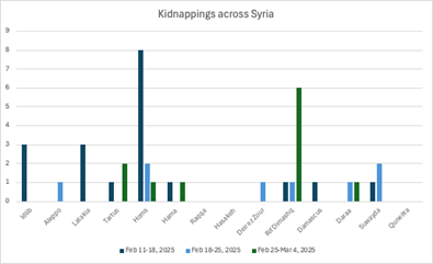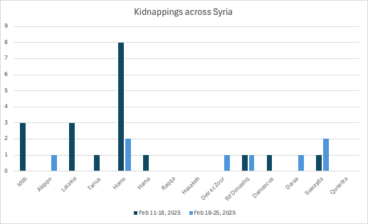 Kidnappings in the weeks February 11-18 and February 18-25. Again, Latakia, Tartous and Hama are either the same or lower than elsewhere, and in the second week they experienced no kidnappings; Homs remained an outlier.