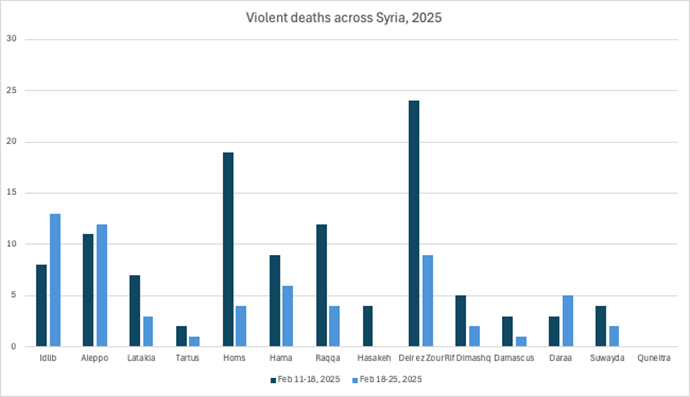 Violent deaths and kidnappings in the weeks February 11-18 and February 18-25 – death figures include those from unexploded ordinance (44 of 111 the first week, 28 of 62 the second week). Clearly, violence in Tartous and Latakia and even Hama was now eclipsed by violence elsewhere; even Homs showed a marked decline the second week.