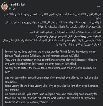 Top: Hanadi Zahlout’s statement mourning her brothers; Bottom: Declaration of 49 Alawite clerics and civil leaders calling for accountability while declaring support for interim government.