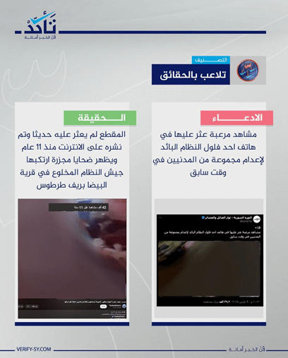 The first is explained in the tweet itself: an example of passing off crimes of the Assad regime as crimes committed now against Alawites. The creator of the original dishonest meme is the strange web-virus calling itself ‘Syrian Girl’, who spent 14 years actively supporting the genocidal crimes of the Assad regime, such as this one she now tries to credit to “Jolani’s gangs.” Similarly, as revealed by the excellent Verify Syria site, the second example is a “widely shared video, allegedly from a fallen regime member’s phone, claimed to show summary executions of civilians. The footage actually dates back to 2013 and documents a massacre committed by Assad’s forces in Tartous.”